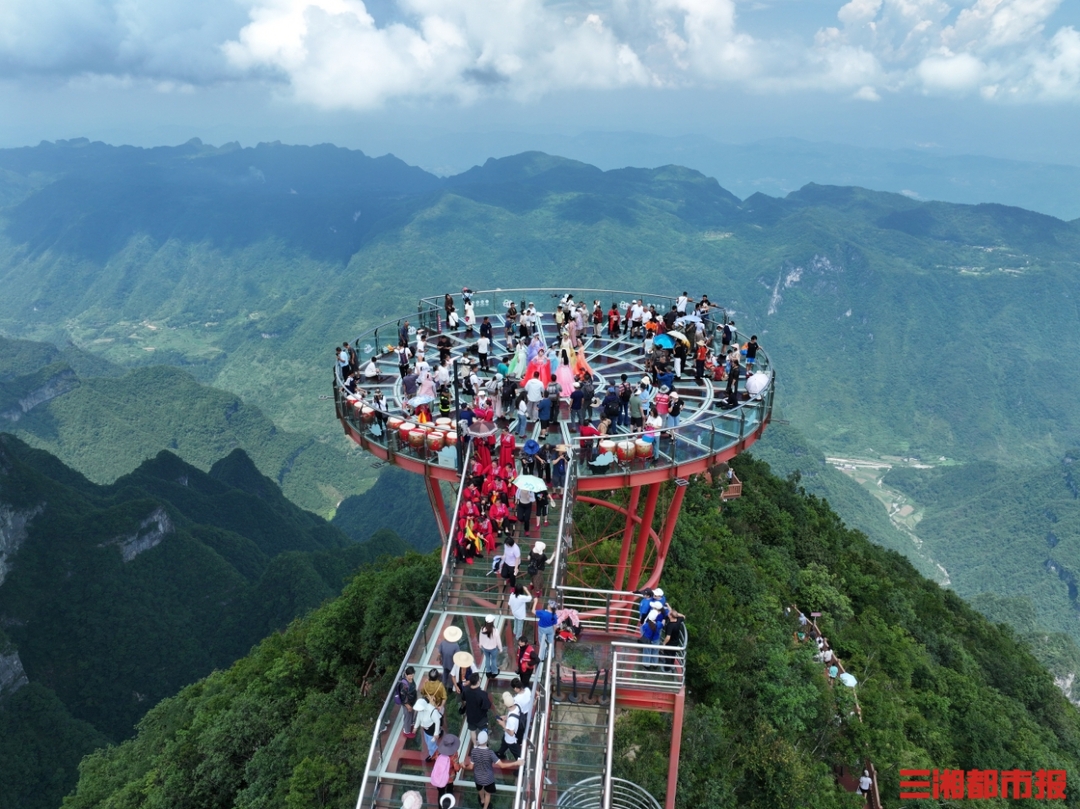 活动现场,七星山景区匠心策划了一系列丰富多彩的演绎。七星山巅1520米高空,最浪漫的表白仪式在“天空之眼”上演,纯净唯美的玻璃栈道搭建了一座现实中的“鹊桥”,张家界知名红娘邀请近300名单身男女嘉宾,在浪漫山巅真情告白。八角亭,各类非遗展演荟萃一堂,火壶、打铁花精彩纷呈。
