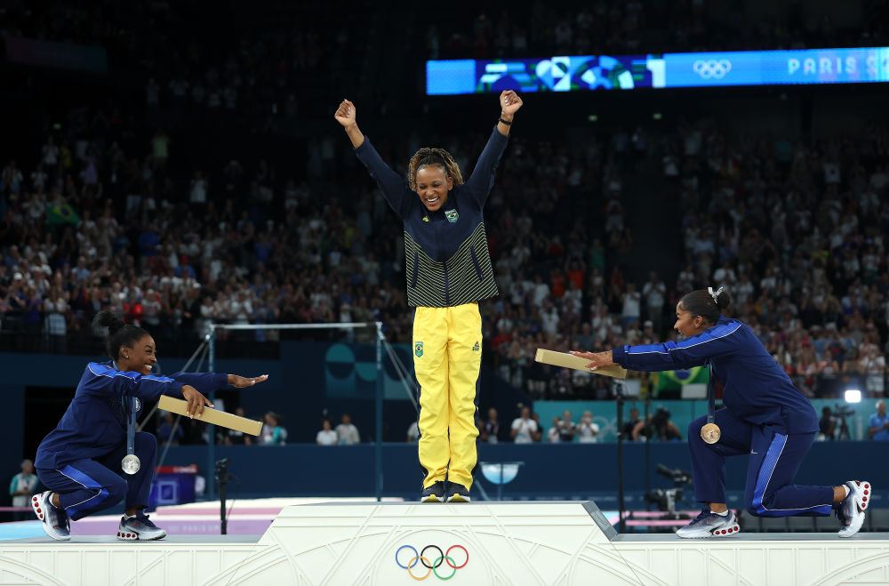 巴黎贝尔西体育馆在体操项目女子自由操的颁奖仪式上两名美国选手拜尔斯和奇利斯一起蹲下向最高领奖台上的巴西选手丽贝卡·安德拉德致敬这一刻,安德拉德俨然一名巴西“奥运女王”在奥林匹克这个大舞台上运动员之间的友情令人动容
