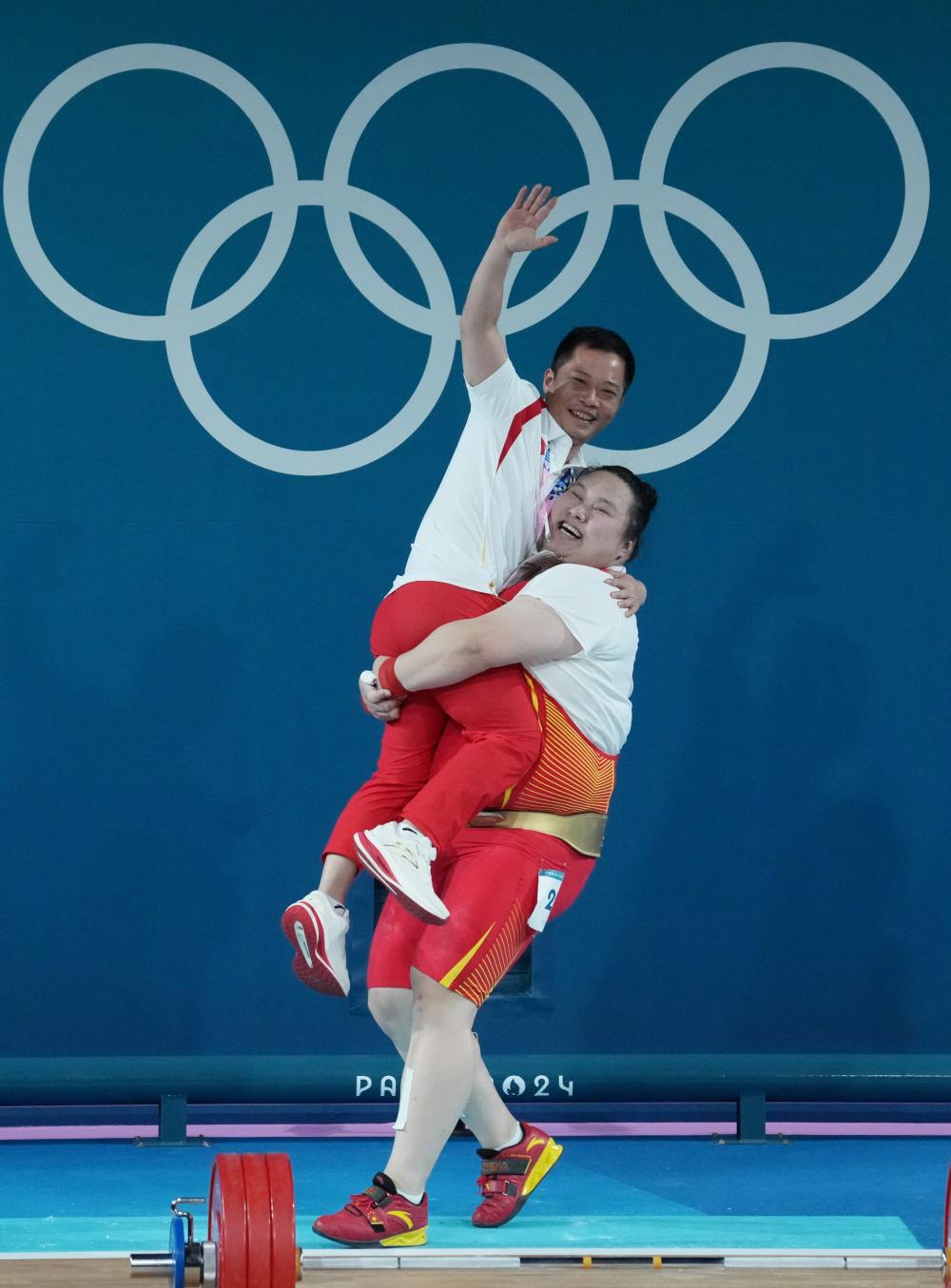 ↑8月11日,在巴黎奥运会举重项目女子81公斤以上级比赛中,中国选手李雯雯(下)抱起教练吴美锦庆祝夺冠。新华社记者 郑焕松 摄