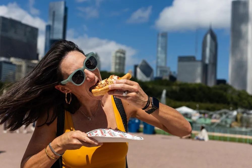 2023年9月9日,一名女子在美国芝加哥美食节上品尝披萨。新华社发(文森特·约翰逊摄)