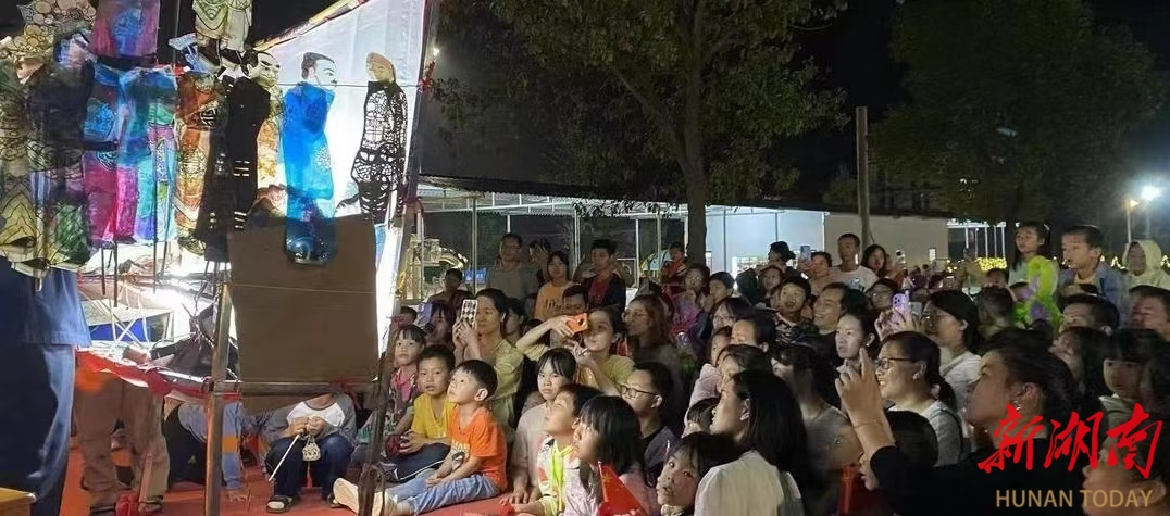 市民在夜间欣赏皮影戏 新塘镇通过联合周边南岳大庙、马场、十八潭旅游、果园采摘、珐琅艺术等网红打卡地,带动当地农产品销售,促进新塘镇土菜餐饮消费。新塘镇郑家坳村主推以“夏日纳凉”主题的夜间户外水上乐园,为游客提供休闲娱乐场所;开展“果园采摘”等亲子活动,带动附近农产品销售,延伸“夜经济”消费链条。同时,衡东县洣水夜经济街区正在申报省级旅游休闲街区。