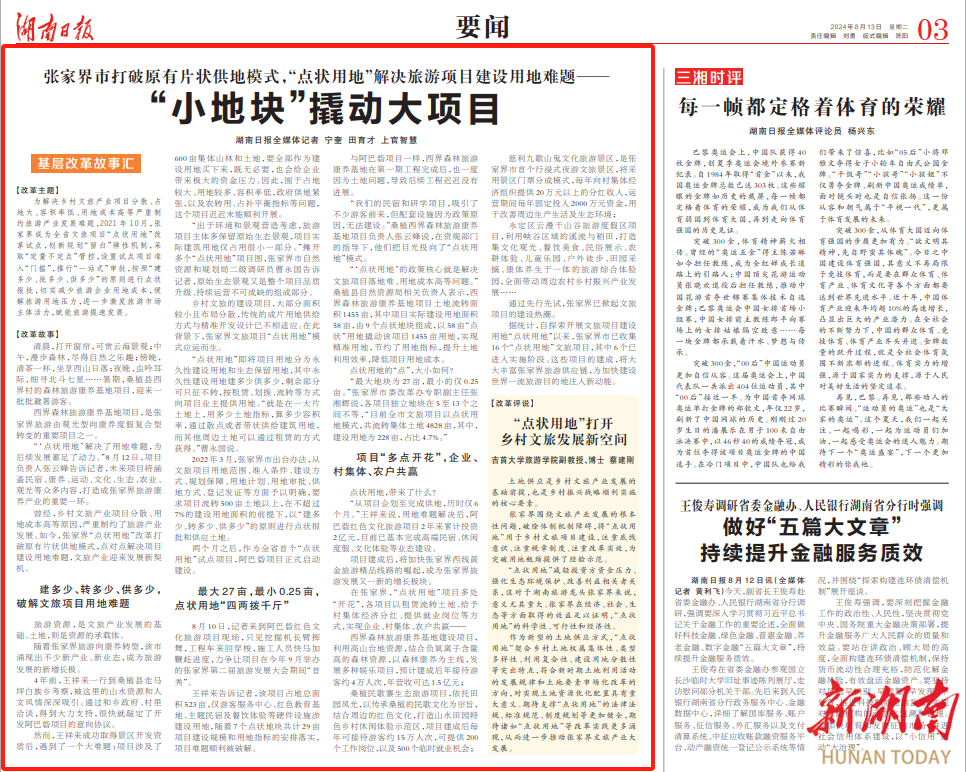 张家界围绕文旅产业发展的根本性问题,破除体制机制障碍,将“点状用地”用于乡村文旅项目建设,注重底线意识、注重规章制度、注重改革实效,为突破用地瓶颈提供了经验示范。