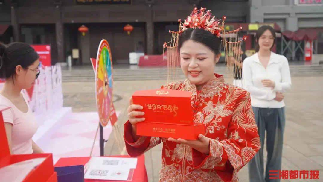 “哇!我们中了个一等奖,奖品是一盒‘福运七龙珠’茶。”体验了幸运大转盘后,新娘黄女士(化姓)欢呼起来。黄女士介绍,她和丈夫在婚礼当天特意买了一张福利彩票,幸运中得20元奖金,中奖的喜悦令她印象深刻,“买彩票就是为了讨个好彩头。”听说有国潮集体婚礼后,本就喜欢中国传统文化的黄女士毫不犹豫地报了名,这次又在现场收获了长沙福彩专属文创品,欢喜不已。