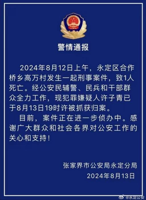 湖南省张家界市公安局永定分局13日晚通过官方微博发布警情通报称,2024年8月12日上午,永定区合作桥乡高万村发生一起刑事案件,致1人死亡。经公安民辅警、民兵和干部群众全力工作,现犯罪嫌疑人许子青已于8月13日19时许被抓获归案。目前,案件正在进一步侦办中。