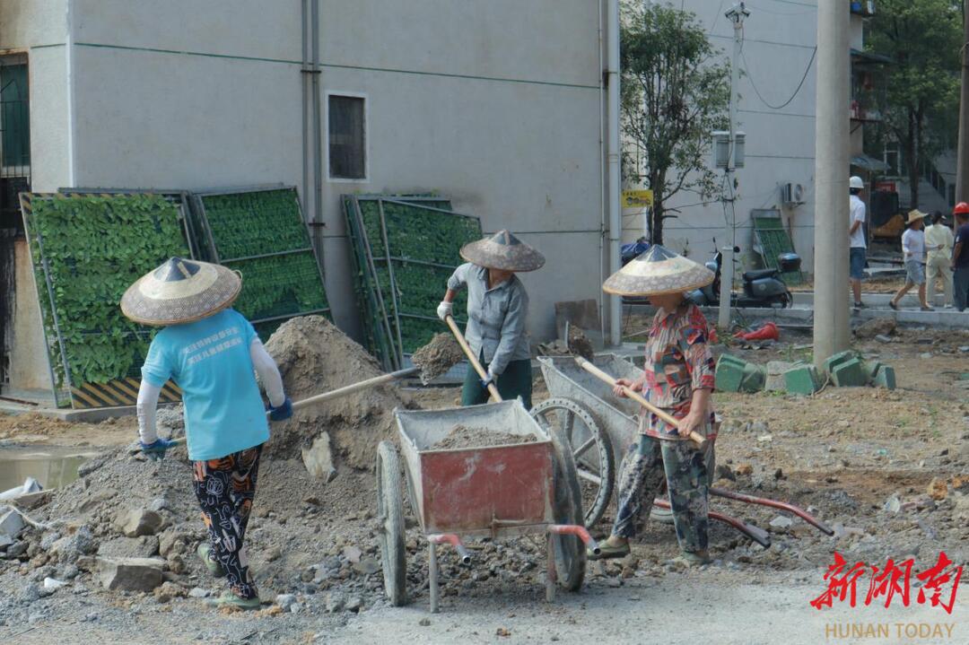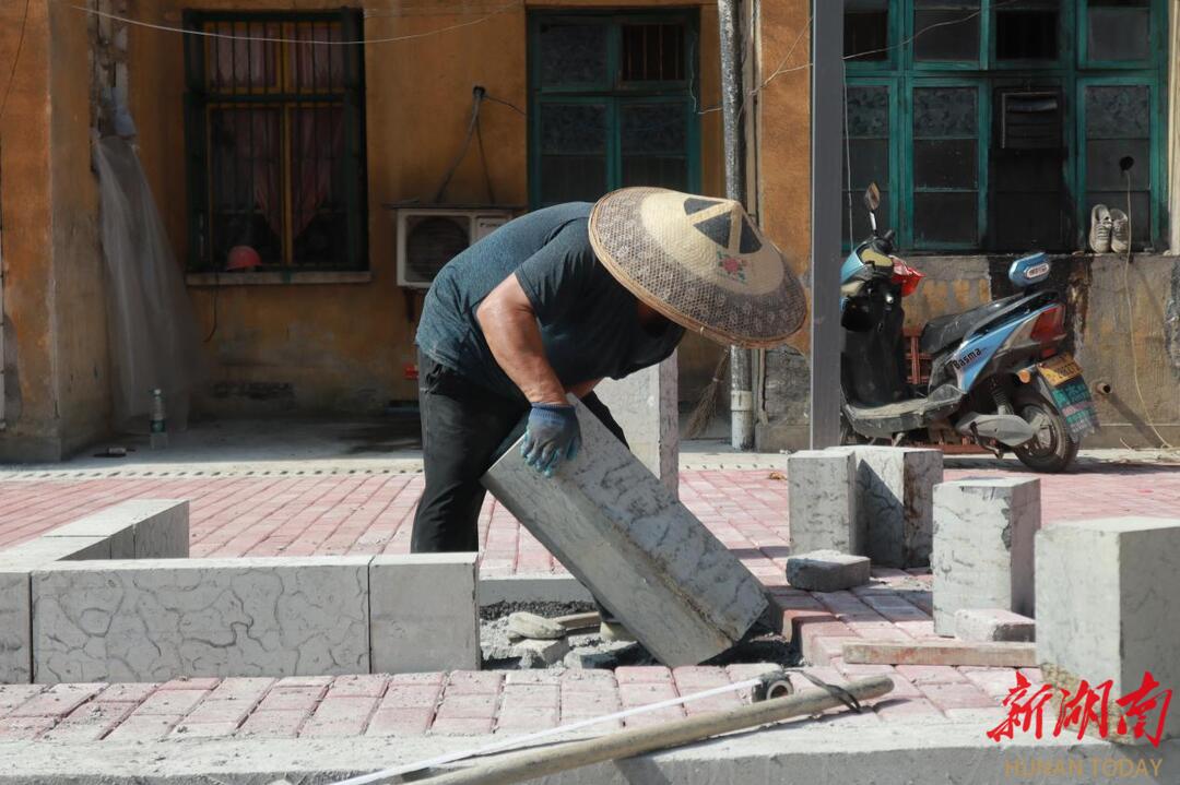 一车车泥沙在工地上来回搬运,一块块石砖在地基上嘭嘭敲实。在湘西土家族苗族自治州吉首市竹园社区烟厂宿舍小区施工地,烟厂路老旧小区改造项目施工队正在热火朝天地作业。随着气温的持续飙升,8月9日10时,室外温度已到达37℃。在工地土基边,记者见到正在搭建树坑石的建筑工人李道良。