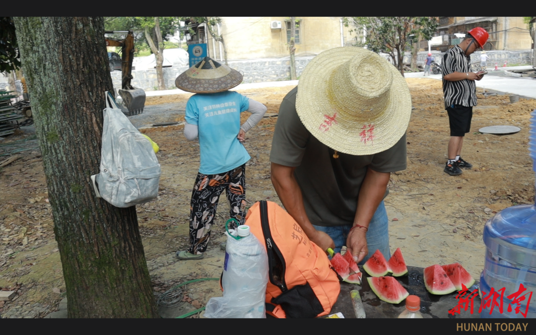 11 时,到了午休时间。在工地旁的树荫下,易长良正在给工人们分西瓜。“工队对我们很好,虽然高温下身体吃不消,但是工队对我们很照顾。”李道良介绍,每天8时许,为防止工人中暑,工队会要求所有工人服用人丹。此外,工地旁备有藿香正气水、十滴水等防暑药物,当有人感觉到不适时,工头会带他们到阴凉通风的地方休息并及时服药,每天中午收工时和下午上工前,会为工人发西瓜。