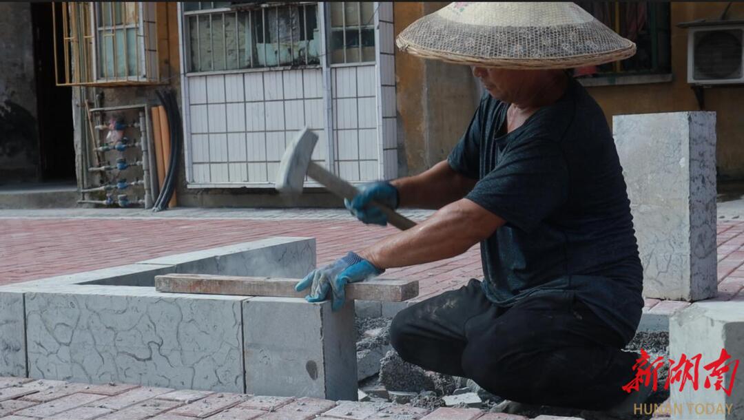 李道良,56岁,湘西州泸溪人。作为家中长子,他21岁便外出打工供家中弟弟妹妹们上学。25岁时进入石匠行业,凭借31年和石头打交道的经验,练就了一门好手艺,成为业内有名的石匠。5年前,他加入郴州晟鑫劳务有限公司工程队,2023年11月随队进场改造,负责铺装工作。