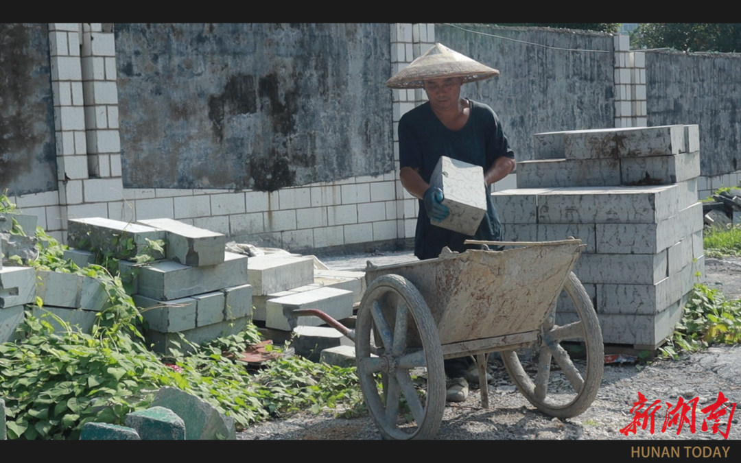 15时30分。李道良回到工地继续工作,拉着推车来到石料堆前,挑选合适的石墩搬到推车上。双手一抱、用膝盖一顶、往车内一放……一套动作一气呵成,一块块重达80斤的石墩就这样被李道良整齐装车运到工地上。