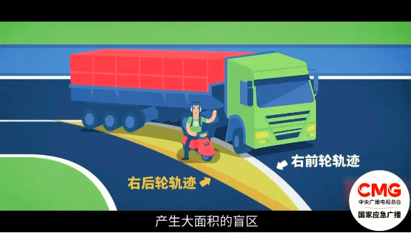 大型车辆转弯时,前、后车轮的运动轨迹不重合,会呈现出弯月形状的盲区。若此时处在这一区域,极易被刮倒、卷入车底,发生碾压事故。
