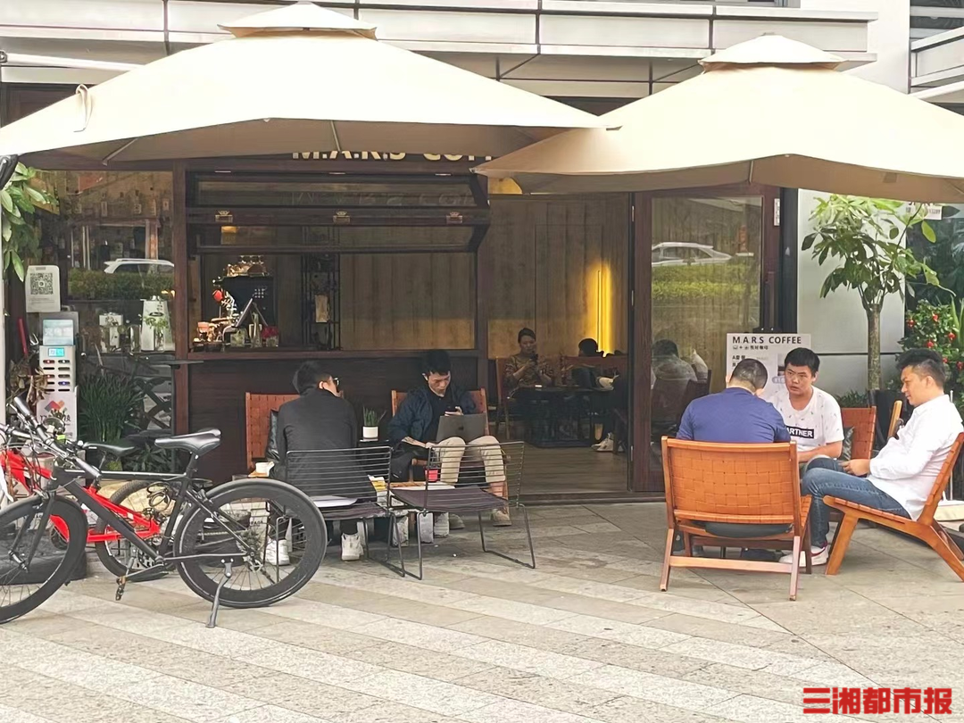 8月13日23时30分,长沙县㮾梨镇旭辉汇樾大厦旁零星路人经过,周围店铺已经打烊,一家咖啡店内懒洋洋地散发出暖光。有人在店门口围坐着轻声谈笑,有人在店内一角安静地办公。几百米外,是火爆的夜市,烧烤啤酒,觥筹交错;小店内吉他、咖啡和小酒,深夜畅聊。一闹一静,都是一天疲惫的慰藉。