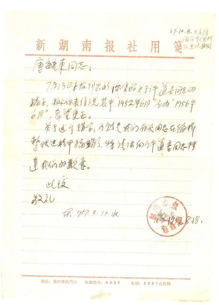 我多方打听得知,是唐老发现了1957年7月13日《新湖南报》刊载的《“老落后”变成先进生产者》报道里的一个瑕疵,立即致信新湖南报社,这封信正是新湖南报社检查组的回信。