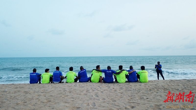2023年3月30日,贝宁科托努市海滩,湖南建设者和当地员工举行友谊足球赛后留影。湖南日报全媒体记者 顾荣 摄