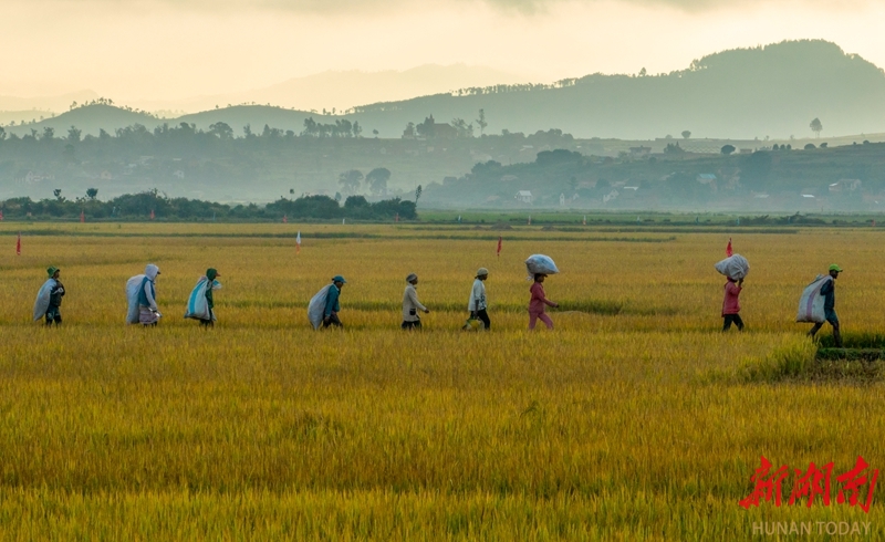 2023年4月26日清晨,马达加斯加马义奇杂交水稻高产示范基地,农民迎着朝霞,走在丰收的田野上。湖南日报全媒体记者 辜鹏博 王珏 摄影报道