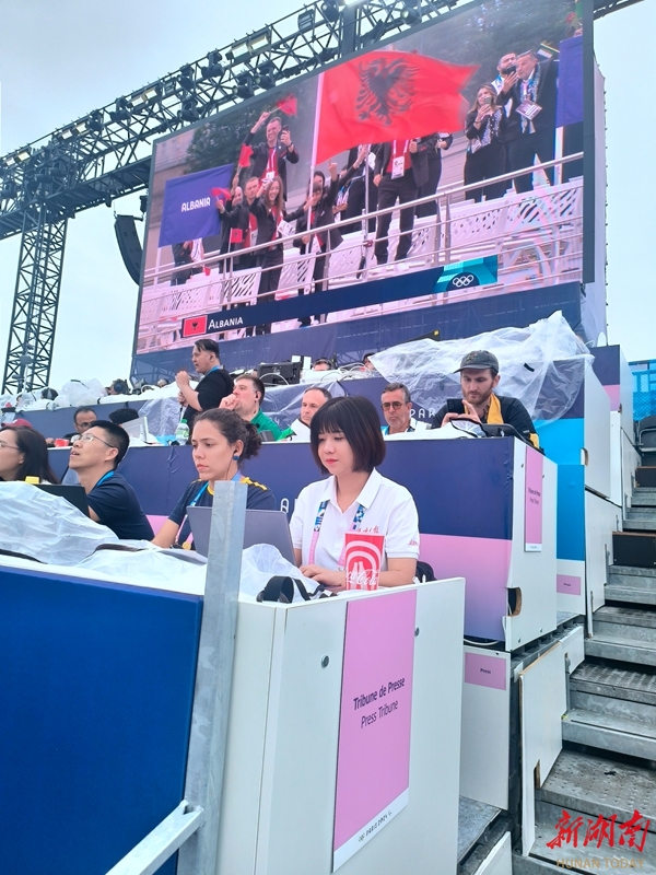 当地时间7月26日,湖南日报全媒体特派记者蔡矜宜(前排右一)在巴黎奥运会开幕式现场。通讯员 摄