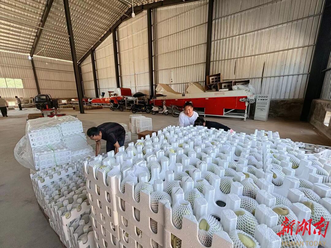 8月14日,临澧县刻木山乡桃树村中华脆蜜桃仓储物流中心,村民们正在忙碌地选果、装篮、打包。