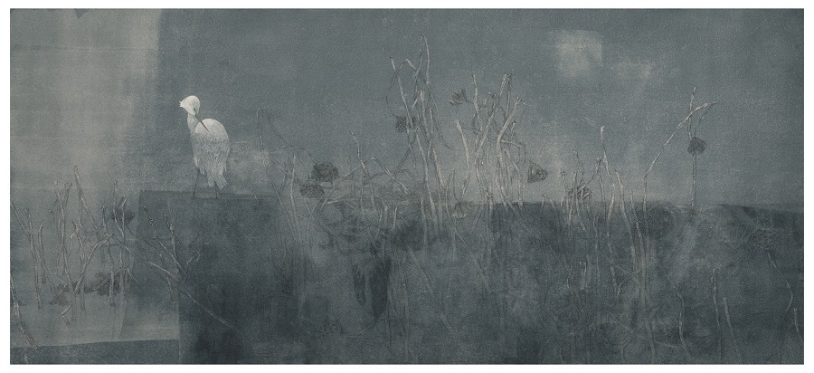 《寒荷独鹭影·二》 纸本设色 100cm×220cm