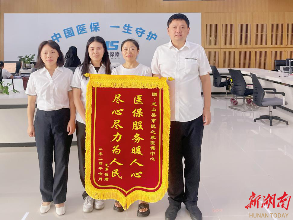 新湖南客户端8月15日讯(通讯员 杨红娇 向娇娇)“尽心尽力为人民,医保服务暖人心。”近日,湘西土家族苗族自治州龙山县民安街道王女士将一面锦旗送到龙山县医保服务大厅,对医保窗口的服务赞不绝口:“工作人员的热情和办事的效率,温暖了我,真心感谢你们!”