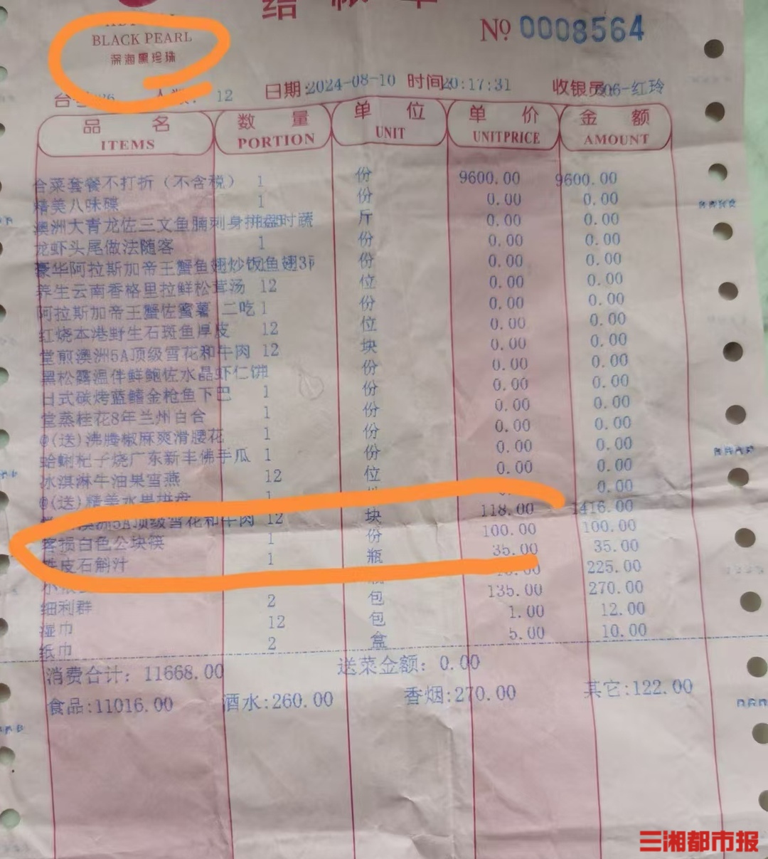 据一名当事顾客回忆,事发于8月10日晚间,损坏的筷子是公筷,是不小心掉下摔断的,并非故意损坏。他们在用餐时,并未看到桌子上有关于筷子价格或者需要小心使用的提示,“如果知道是这么贵的筷子,我们肯定会小心使用,或让店家直接拿走。”
