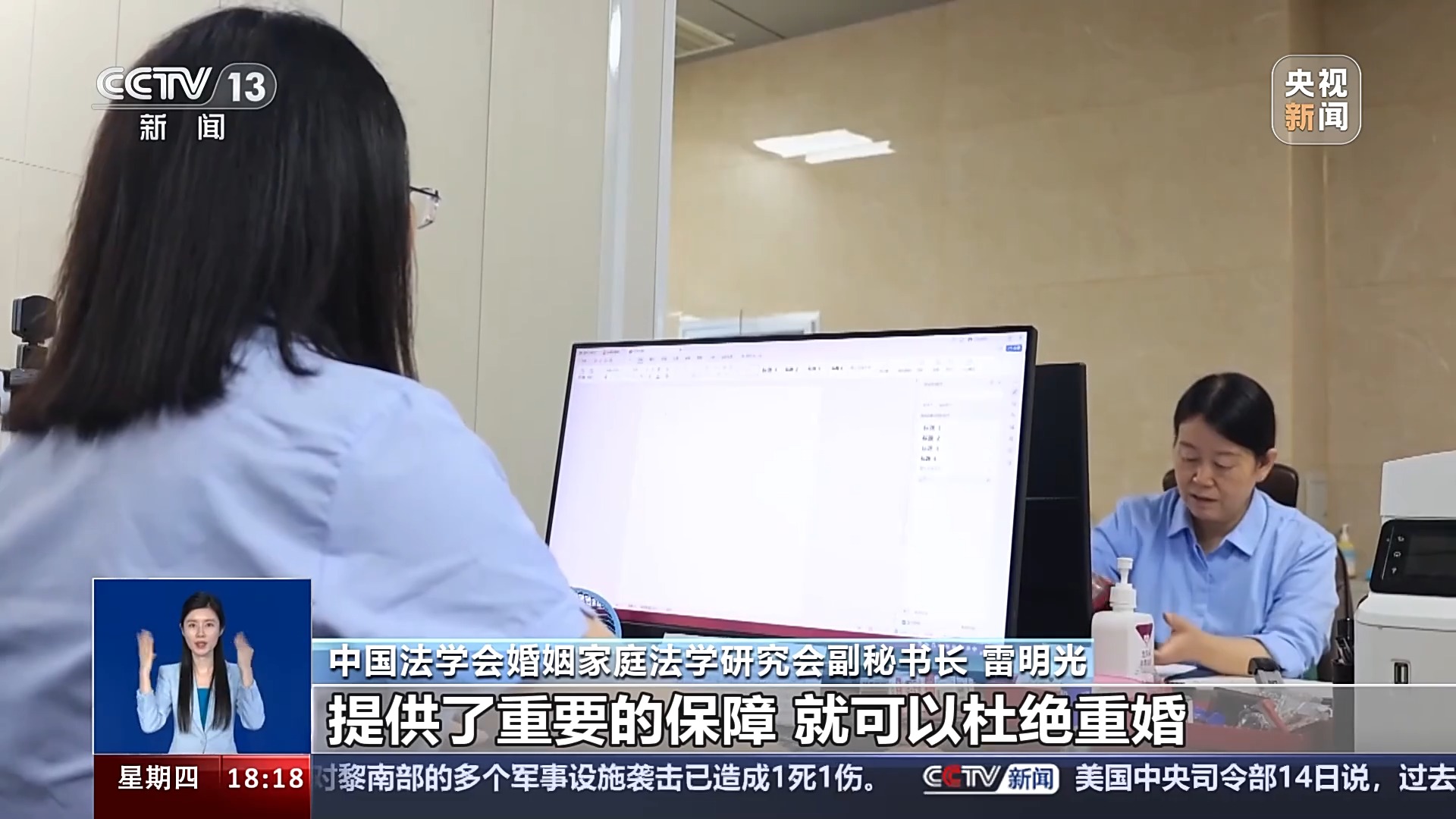 中国法学会婚姻家庭法学研究会副秘书长雷明光:这次草案取消了婚姻登记的地域的限制,不管是结婚登记还是离婚登记都不再需要户口本,不仅实现了我们国家内地居民婚姻登记的跨省通办,在任何一个地方都可以办理结婚登记和离婚登记,同时为实现婚姻登记的全国的信息统计提供了重要的保障,就可以杜绝重婚。