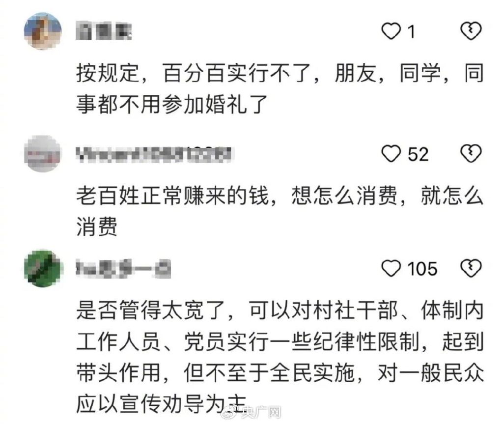 对于“彩礼控制在6万元以内,提倡零彩礼”的情况,该负责人说,“当地有订婚(会亲家)的风俗。男方家长带着一定数额的彩礼与女方家长见面,但是女方一般当场会‘回礼’,从礼金中拿出一部分让男方再带回去。”该负责人说,这次听取了群众和红白理事会建议,希望通过倡议,将彩礼降到6万元以内。