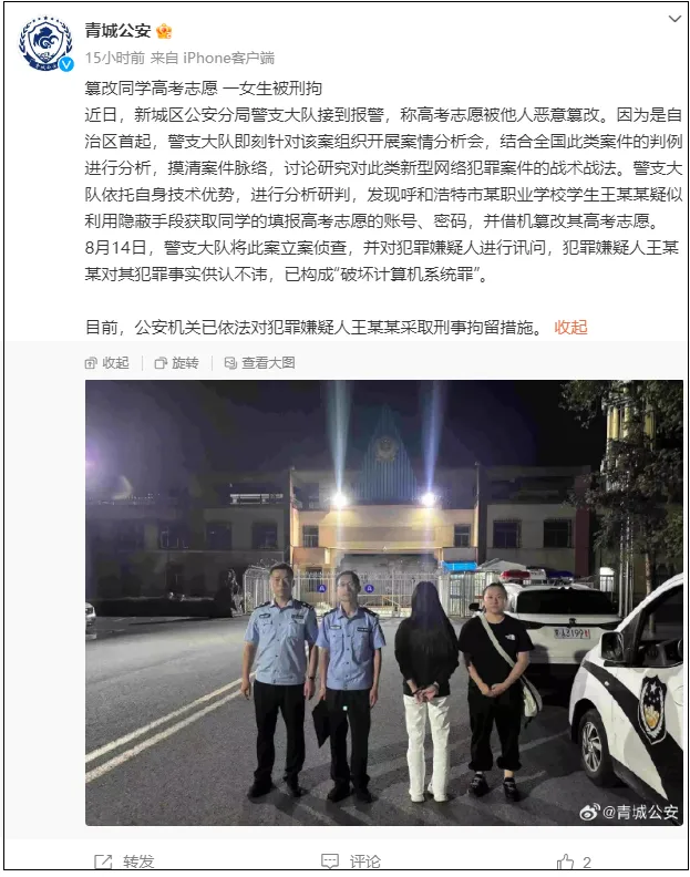 内蒙古自治区呼和浩特市公安局官方微博(@青城公安 )8月15日消息,近日,新城区公安分局警支大队接到报警,称高考志愿被他人恶意篡改。因为是自治区首起,警支大队即刻针对该案组织开展案情分析会,结合全国此类案件的判例进行分析,摸清案件脉络,讨论研究对此类新型网络犯罪案件的战术战法。警支大队依托自身技术优势,进行分析研判,发现呼和浩特市某职业学校学生王某某疑似利用隐蔽手段获取同学的填报高考志愿的账号、密码,并借机篡改其高考志愿。