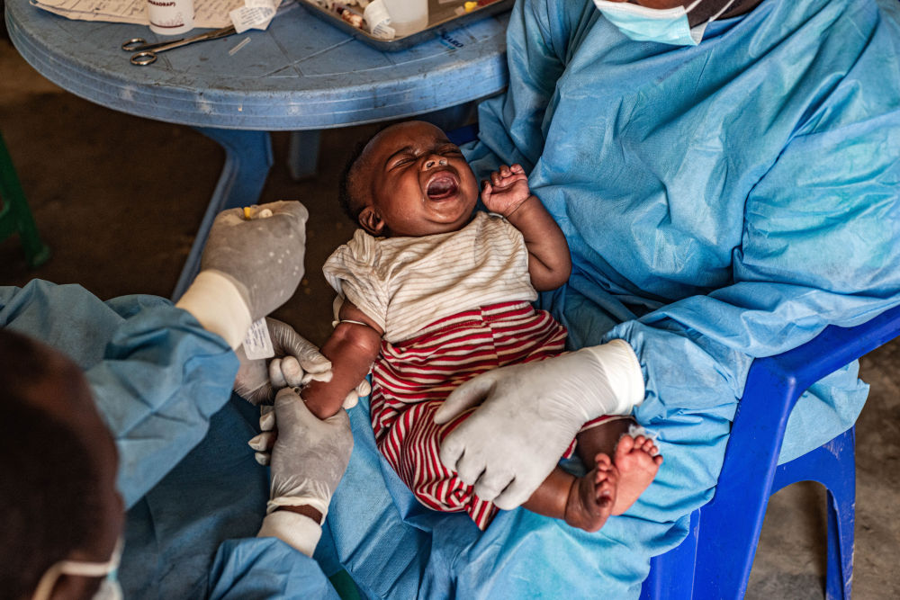 ↑8月15日,在刚果(金)北基伍省首府戈马市附近尼拉贡戈地区的一座医院里,医务人员对感染猴痘病毒的儿童进行治疗。新华社发(扎南摄)