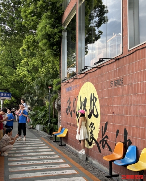 (游客在长沙沿江酒吧外打卡墙合影。)