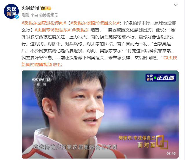 央视专访樊振东,樊振东坦言,一度因饭圈文化感到困扰。他说:“场外很多东西被过度关注,压力很大。有时候会觉得输球不行,赢球好像也没那么行。这对我、对队伍、对乒乓球、对大家的团结,有百害而无一利。”巴黎奥运后,不少网友揣测他是否要退役,对此,樊振东表示:“打完这届后确实非常累,我需要好好休息。目前还没考虑下届奥运会,未来怎么样,交给时间吧。”