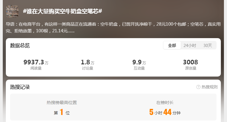 空牛奶盒,已剪开洗净晾干,100个28元;空笔芯,真实用完、拒绝放墨,100根21.14元……近日,话题“谁在大量购买空牛奶盒空笔芯”冲上微博热搜,引发关注和热议。