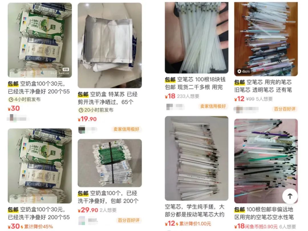 某二手交易平台上部分出售的空牛奶盒、空笔芯。
