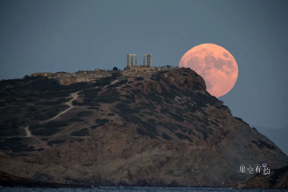 2023年8月30日,“超级月亮”从希腊苏尼翁角的波塞冬庙上空升起。新华社发(马里奥斯·罗洛斯 摄)