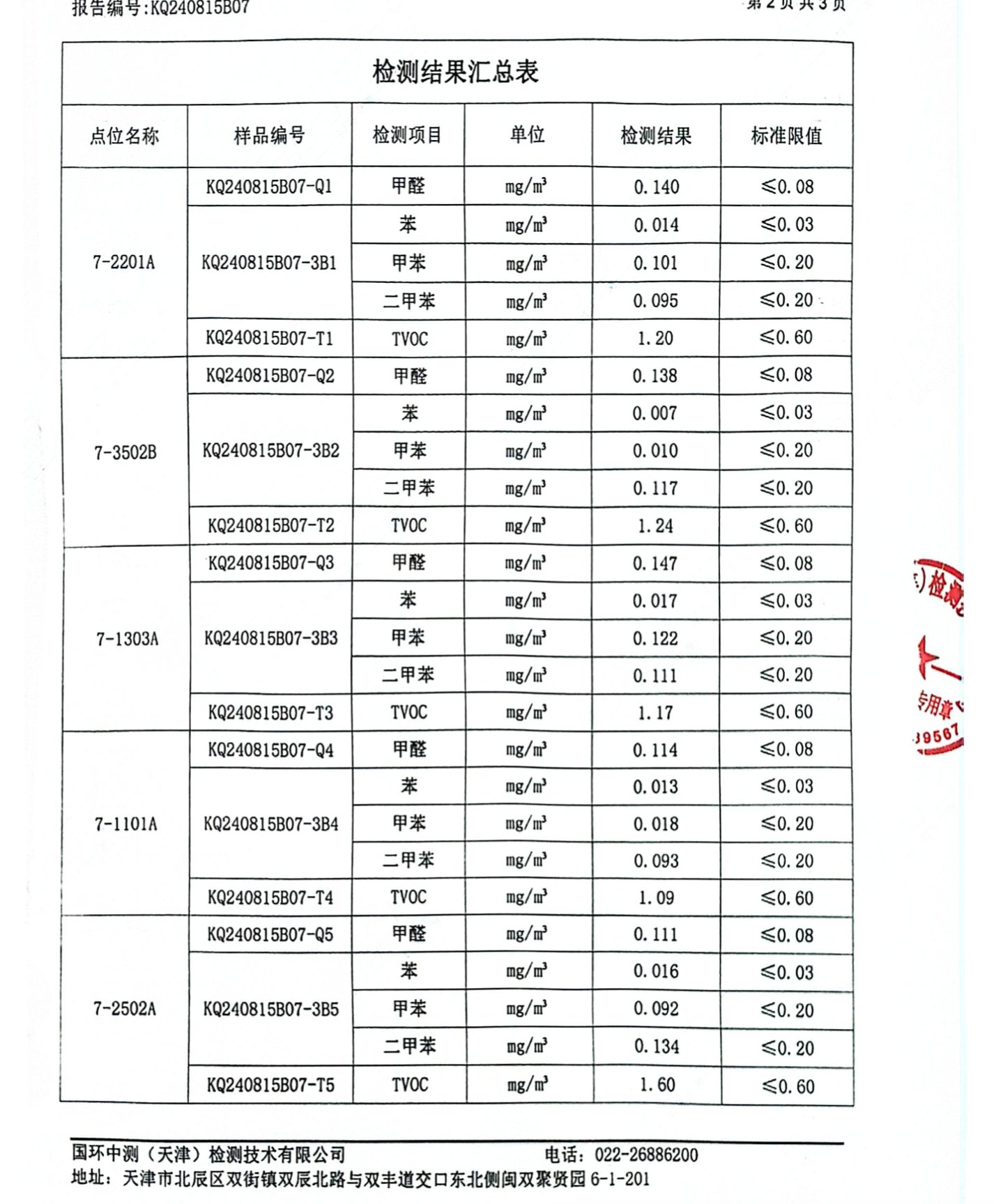 8月19日,学生们委托的第三方检测机构国环中测(天津)检测技术有限公司提供了详细的检测报告,检测结果显示,成于思公寓的7个检测点的甲醛数据在0.1-0.15之间浮动,根据《室内空气质量标准》甲醛HCHO标准限值为≤0.08的要求,均不合格。而TVOC则在1.09-1.6之间浮动,根据《室内空气质量标准》对总挥发性有机化合物TVOC的标准要求,已超出≤0.6的限值。