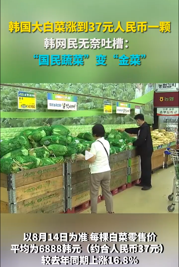 人民日报海外网援引韩联社报道称,韩国农水产食品流通公社数据显示,以8月14日为准,每棵白菜零售价平均为6888韩元(约合人民币37元),较去年同期上涨16.8%。有网民吐槽,韩国“国民蔬菜”变成了吃不起的“金菜”。报道说,减产导致白菜价格飙升,而减产的原因,与白菜种植面积缩小和酷暑持续有关。