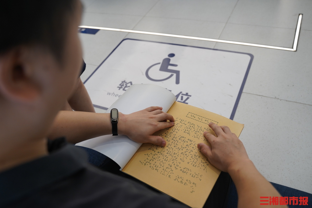 黄斌在触摸盲文业务指南。朱帅铭摄。