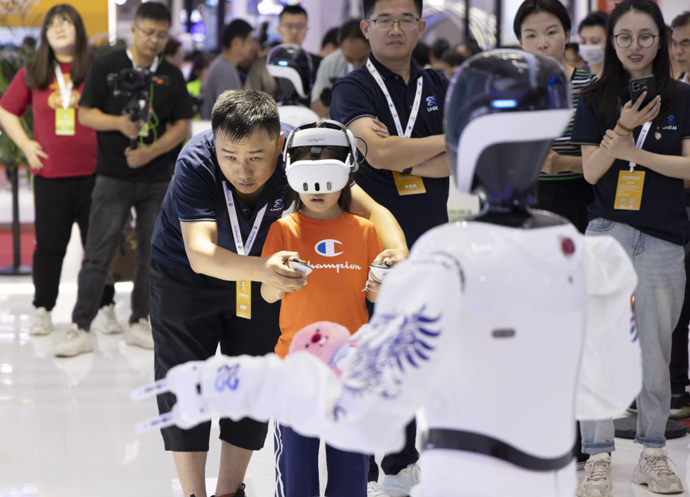 ↑8月21日,在2024世界机器人大会现场,小朋友在沉浸式体验“抓娃娃”。