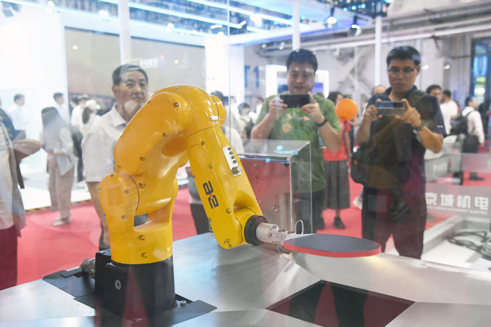 ↑8月21日在2024世界机器人大会现场拍摄的桌面型工业机器人。