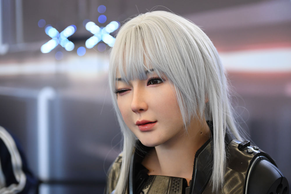 ↑8月21日,2024世界机器人大会现场的一款多模态情感交互机器人向观众“眨眼”。