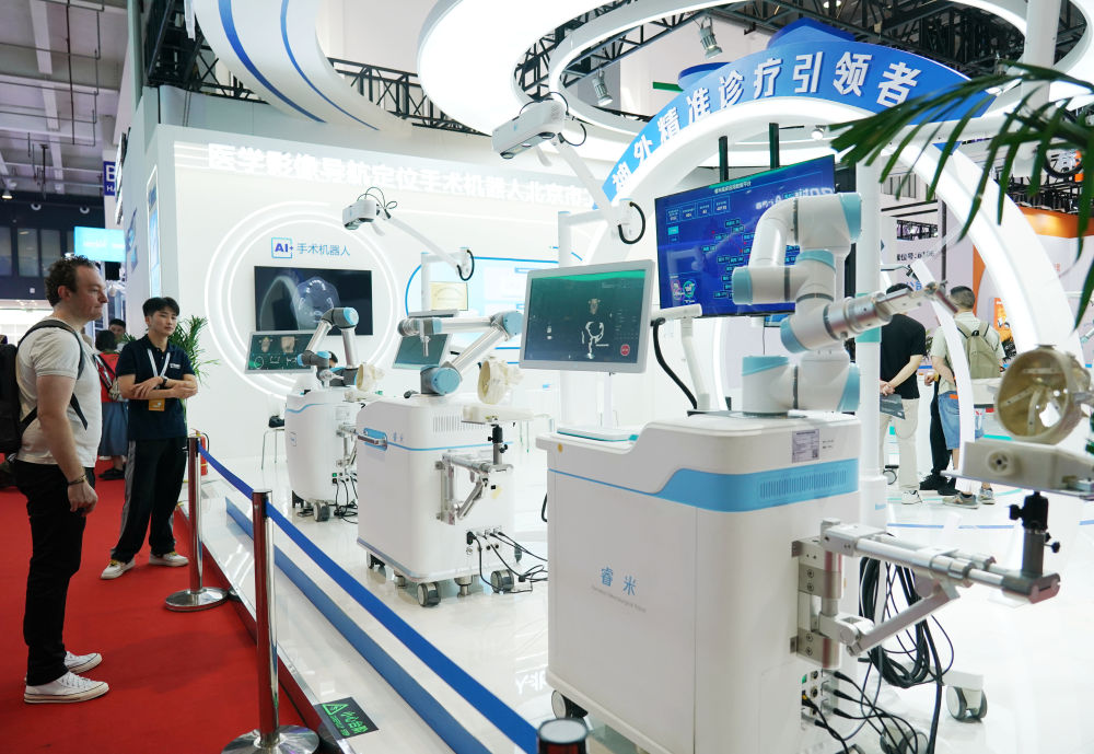 ↑8月21日,在2024世界机器人大会现场,参观者被手术机器人吸引。