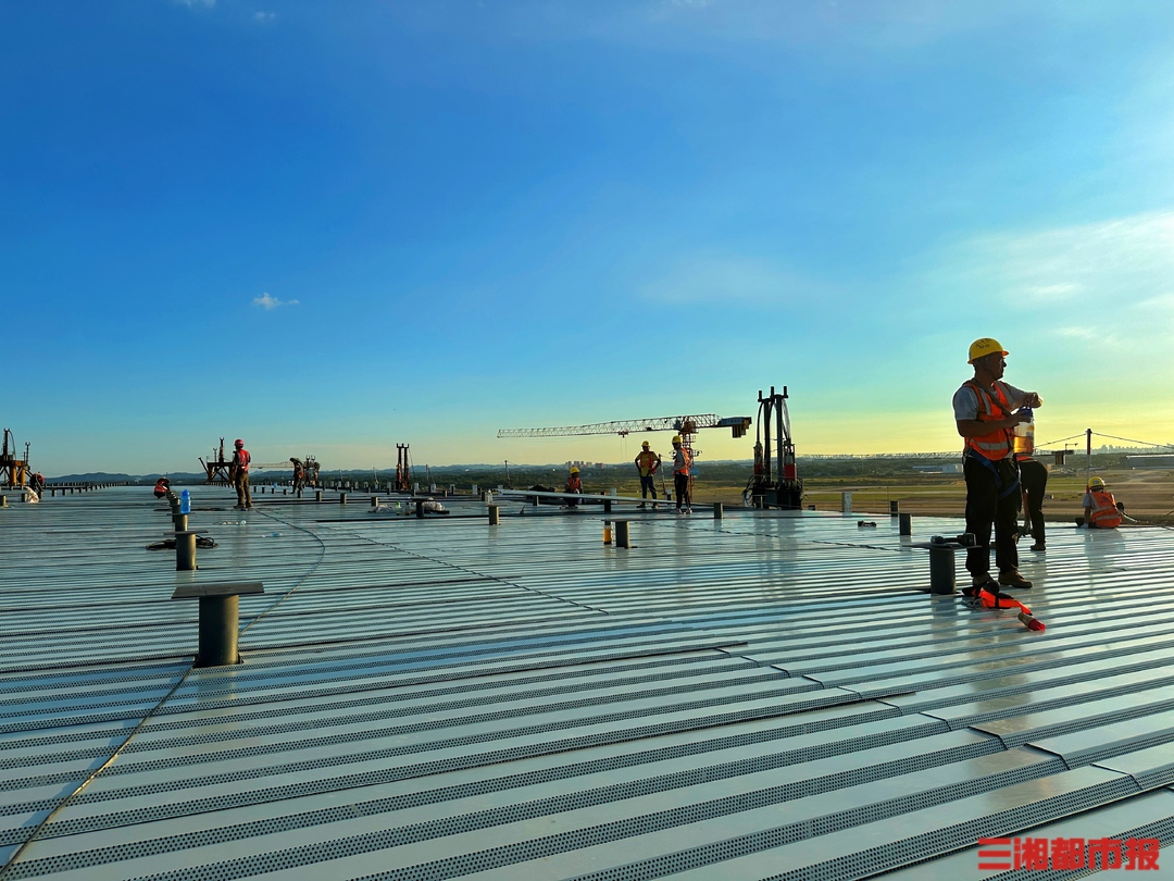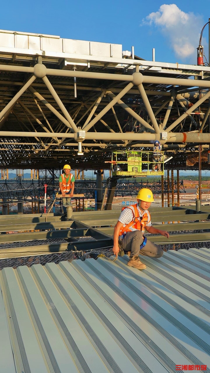 长沙黄花机场T3航站楼项目F大厅顶上的金属屋面,作业人员正在施工。王翊玮 摄