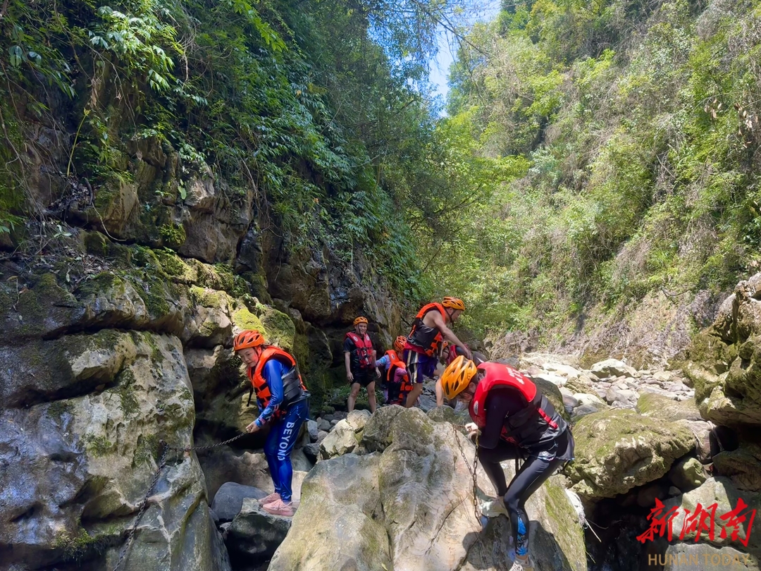 顺激流、过滑梯、游深潭、淋瀑布、踏青苔,险阻与挑战一路相随。在浅水区,游客三三两两地坐在鹅卵石上休息,清澈的河水与七彩的鹅卵石相互映衬,让人沉醉其中。