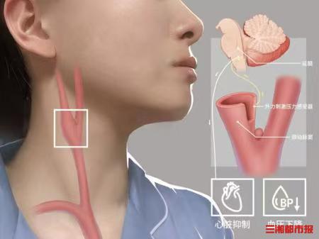 该院儿科副主任江杰介绍,颈动脉窦为颈内动脉起始处的膨大部分,当颈动脉窦感受到血压升高或受到压迫、牵拉时,可通过神经反射调节心率和血压,使心率变慢、血压变低,严重者可导致脑部缺血。