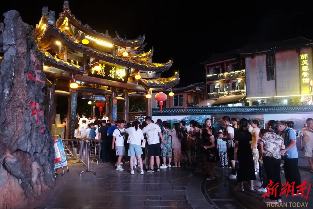 湖南日报·新湖南客户端8月24日讯(见习记者 瞿文君)8月23日,夜幕降临,湘西土家族苗族自治州永顺县芙蓉镇景区的夜景灯光逐渐亮起,亮闪闪地装扮着这个挂在瀑布上的千年古镇。20时,景区入口仍有不少游客排着长队等待检票。这个八月,芙蓉镇迎来客流小高峰,每日客流量突破一万人次。