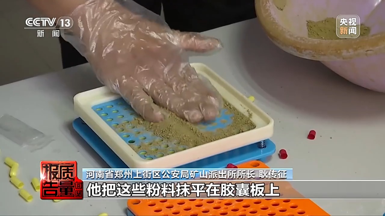 河南省郑州上街区公安局矿山派出所所长 耿传征:脸盆里的这些粉料就是当时在杨某某的窝点查获的剩余粉料,他把这些粉料抹平在胶囊板上,填充胶囊,然后再把胶囊逐渐压实。环境非常脏乱,都是用手工进行搅拌,然后手工装填。