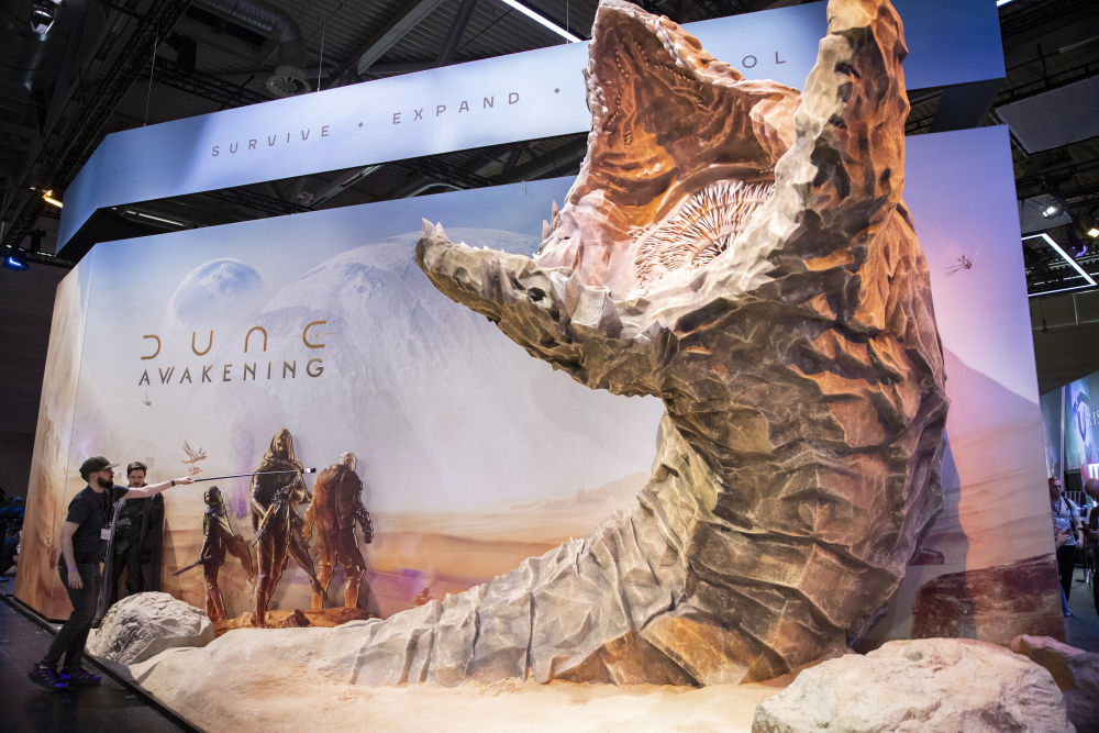 8月21日,一名男子在德国2024年科隆国际游戏展腾讯展台为《沙丘:觉醒》模型拍照。