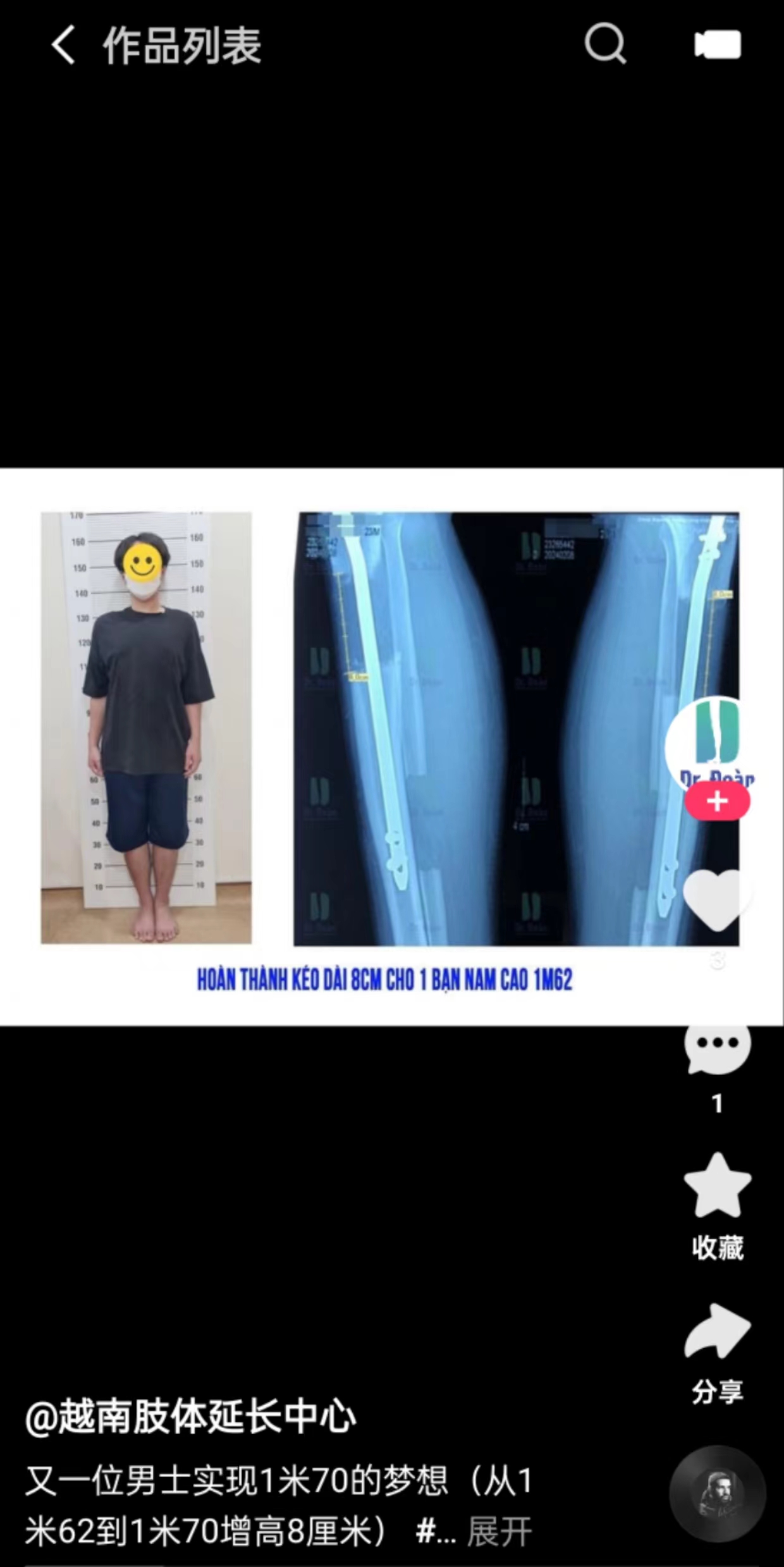此前,记者在多个社交平台搜索,发现多个账号在不同平台宣传“断骨增高术”。在快手上,以“增高”“长高”为关键词,能搜到名为“bubuzenggao”账号,其发布了多条在国外做这一手术的视频。而该账号的个人资料留有微信号和QQ号。以“肢体延长”为关键词,则出现两个“越南肢体延长中心”账号,其发布的多个视频均标注有“断骨增高”“骨延长”等字眼。该账号也留有微信号。