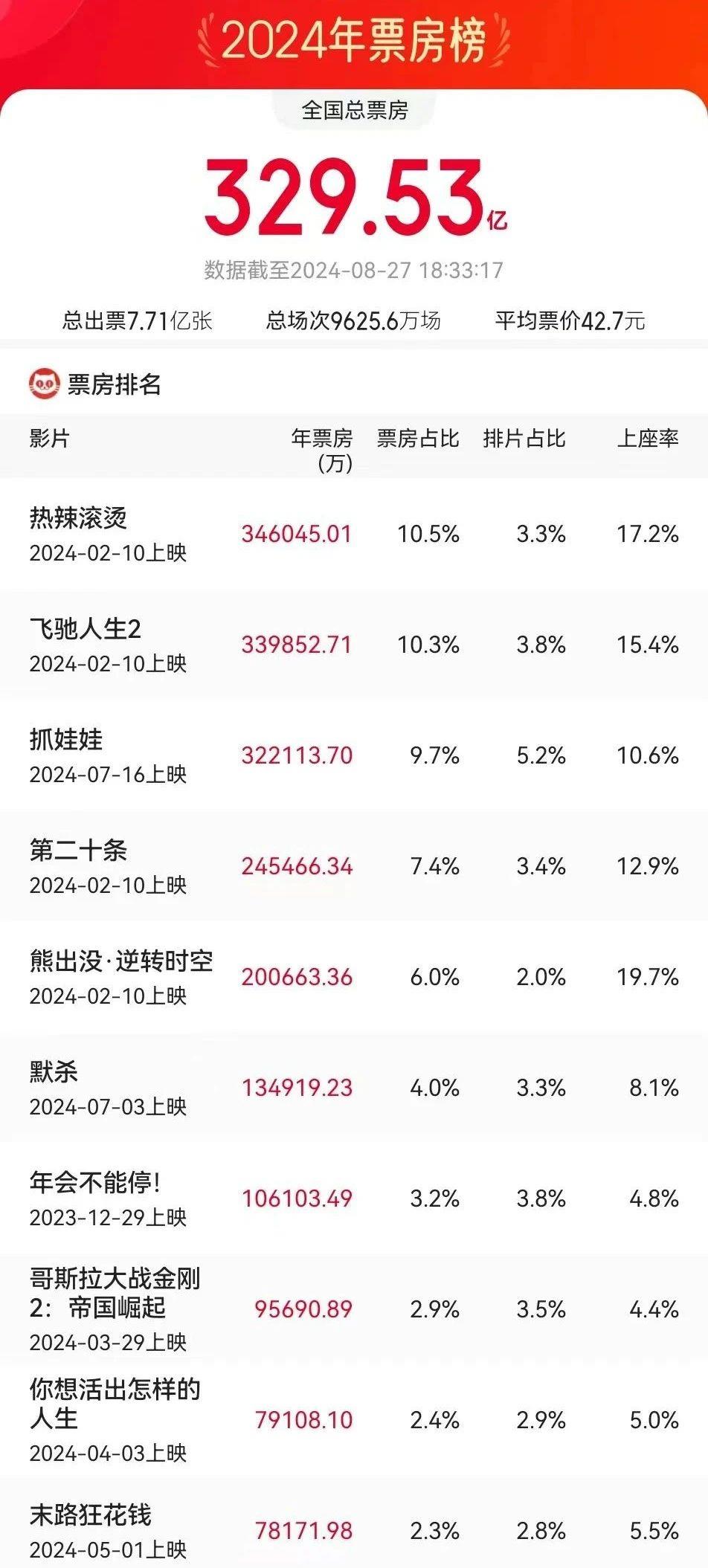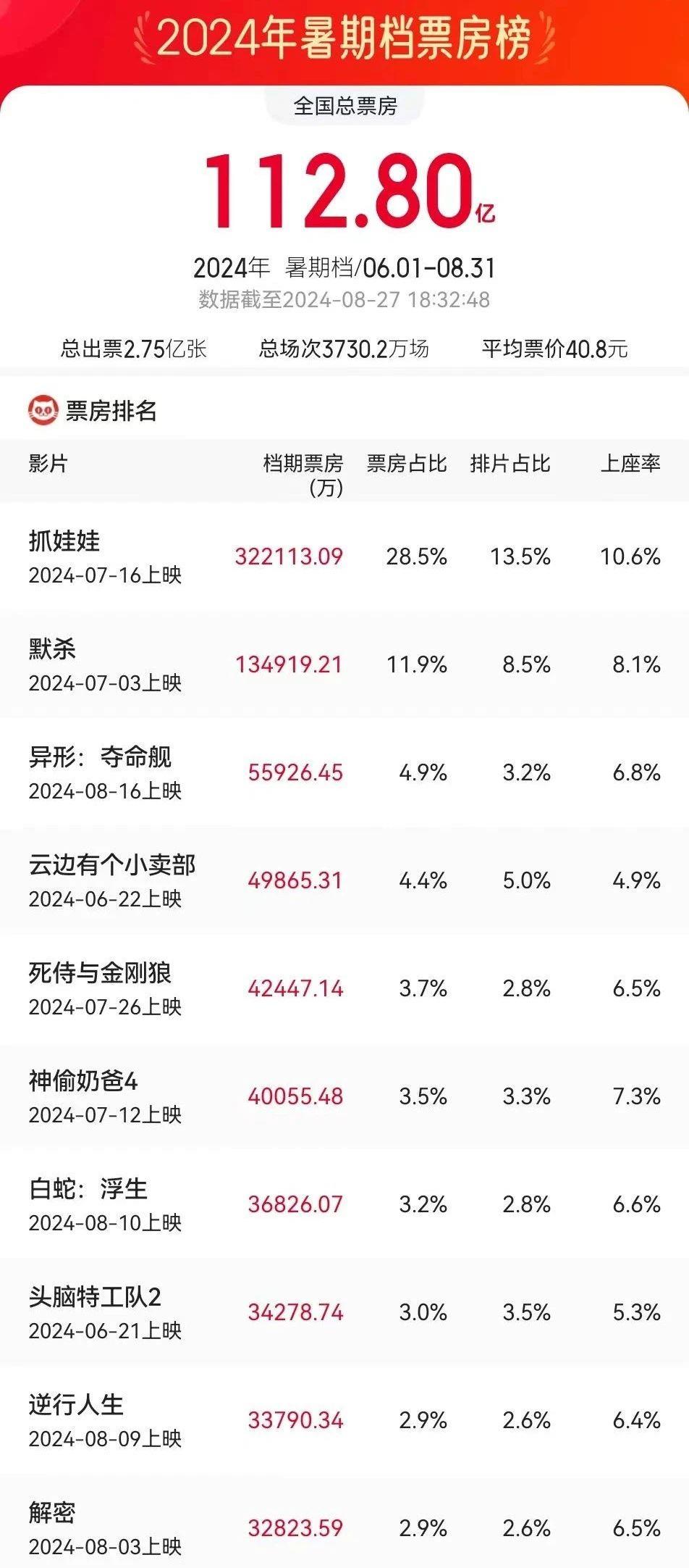 2024年暑期档进入尾声,据网络平台实时数据,截至8月27日18时32分,暑期档(6—8月)档期总票房(含预售)已突破112亿元。《抓娃娃》《默杀》《异形:夺命舰》暂列档期票房榜前三位。
