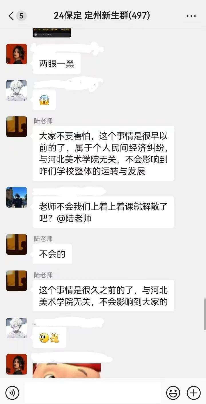 “早上看到消息就问了老师,老师说这是校长女儿个人行为,影响不到学校。”书法学院2024级新生小邹(化名)接受湖南日报记者采访时表示,老师已在群员497人的“保定 定州新生微信群”内澄清,学校不会“上着上着课就解散了”,新生缴学费的截止日期是9月6日。