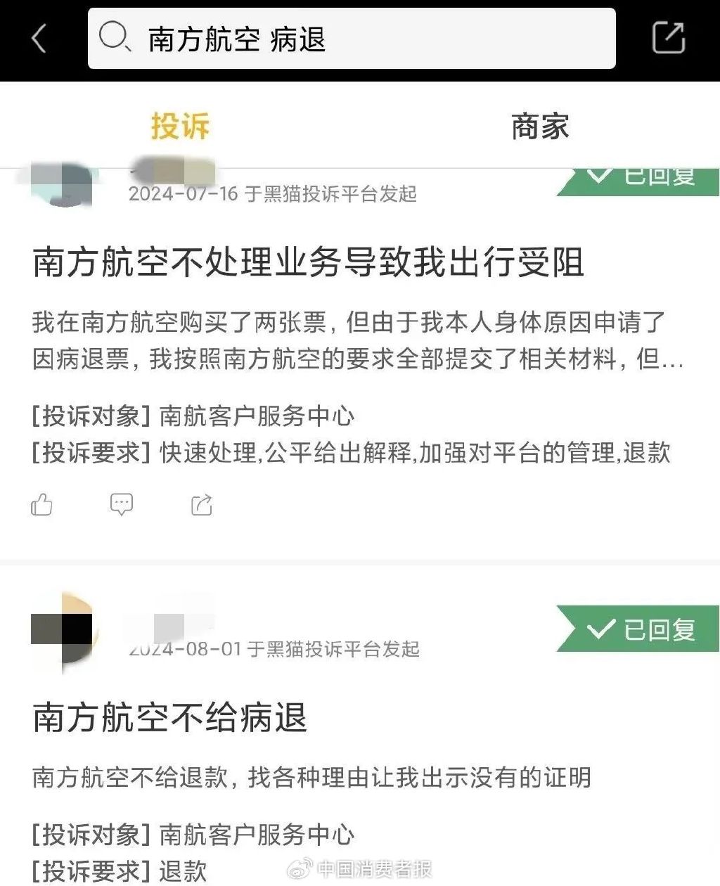 记者查询发现,在黑猫投诉平台,有272宗消费者投诉涉及南航办理病退机票审核慢、客服不专业、病退申请无法撤回修改等。