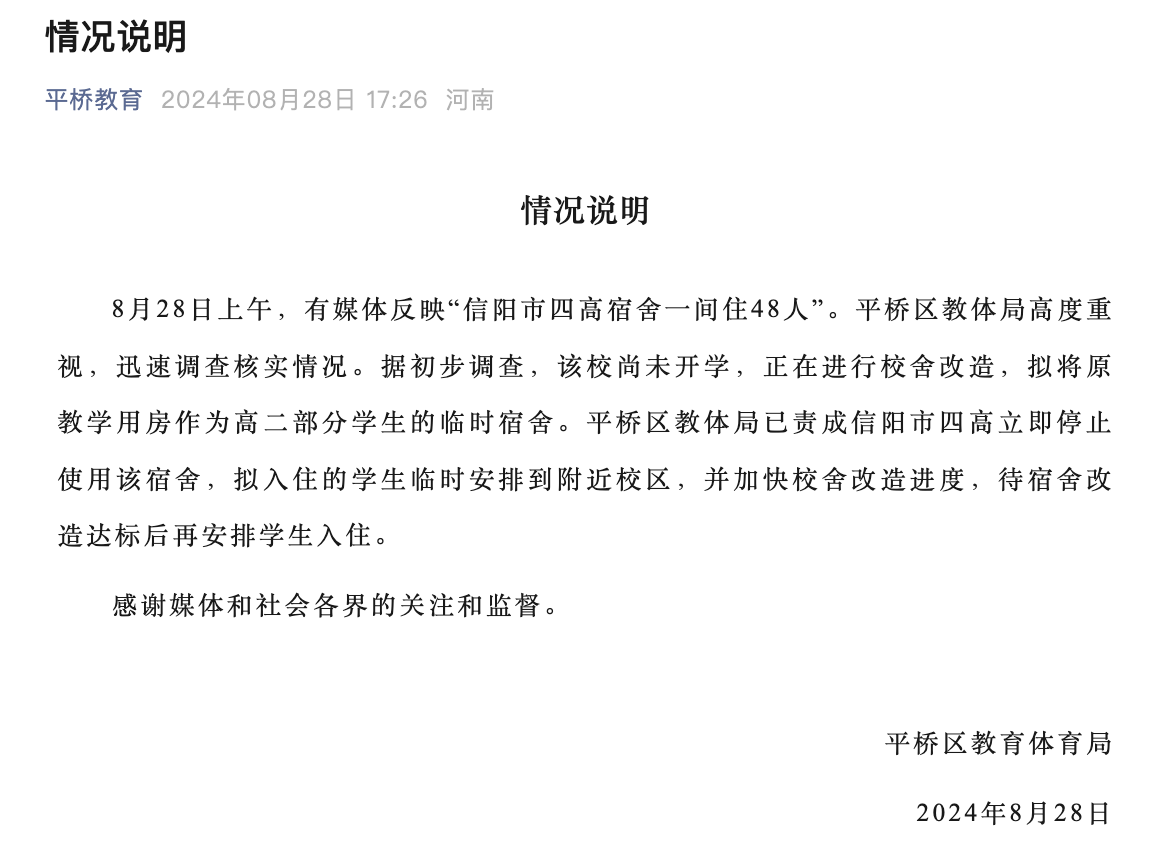 8月28日上午,有媒体反映“信阳市四高宿舍一间住48人”。平桥区教体局高度重视,迅速调查核实情况。据初步调查,该校尚未开学,正在进行校舍改造,拟将原教学用房作为高二部分学生的临时宿舍。平桥区教体局已责成信阳市四高立即停止使用该宿舍,拟入住的学生临时安排到附近校区,并加快校舍改造进度,待宿舍改造达标后再安排学生入住。