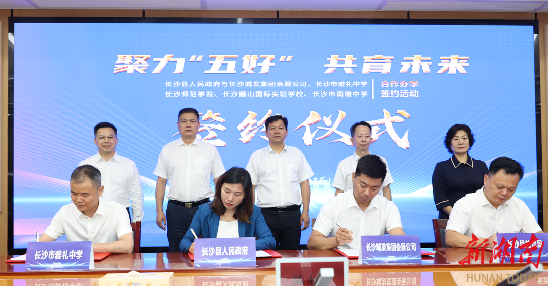 8月29日上午,在长沙市教育局、长沙城发集团领导共同见证下,长沙县人民政府与长沙城发集团会展公司、长沙市雅礼中学、长沙麓山国际实验学校、长沙市南雅中学、长沙师范学院合作办学签约仪式活动在长沙县人民政府举行。雅礼中学新校区项目落定长沙国际会展新城片区,长沙国际会展新城优质教育布局已逐步由规划落为现实。